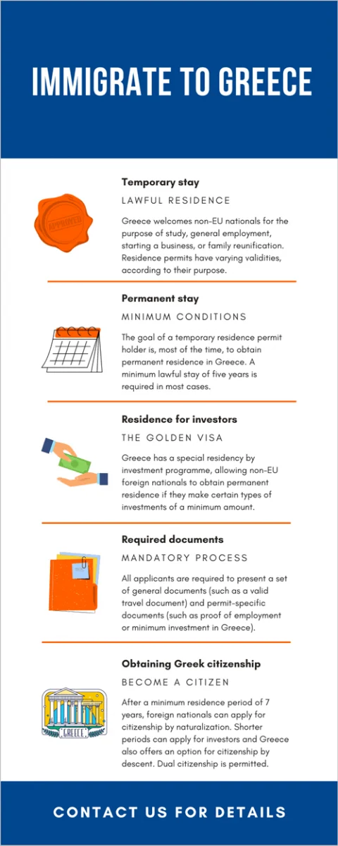 Are you interested in applying for a resident permit for Greece? Our team will answer all your questions, according to your nationality and, most importantly, your purpose of stay and situation (i.e. if you are traveling alone or with one or more family members). We offer complete assistance during the pre- and the post-application phases, so do not hesitate to reach out to us.