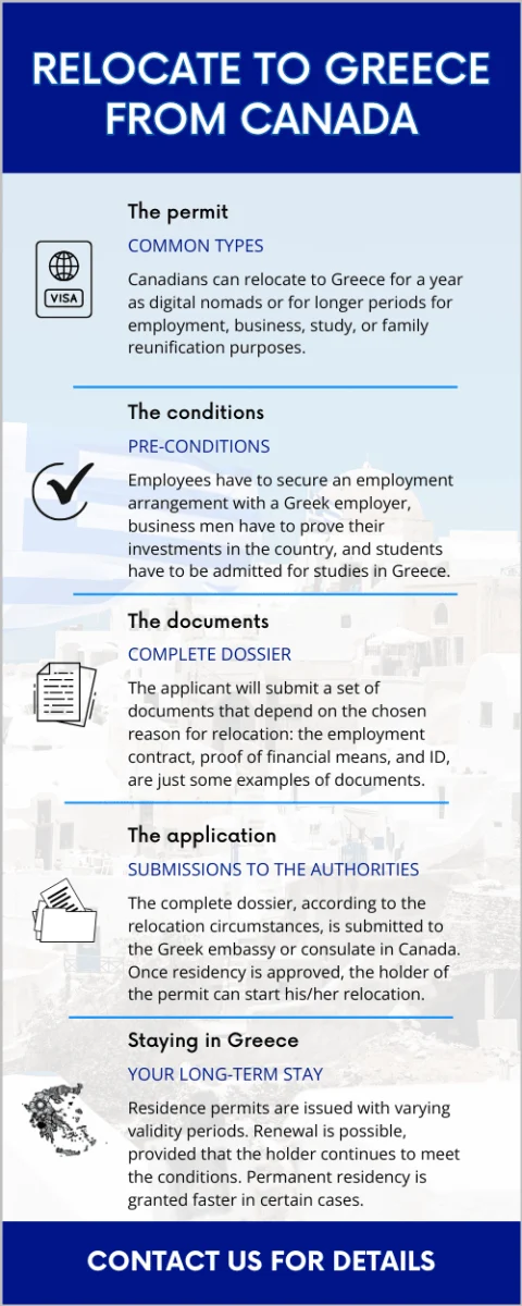 If you have just decided to immigrate to Greece from Canada, this short guide can provide some useful information on the residence permit in Greece requirements. If you need more details, as well as personalized assistance during relocation, you can always ask our specialists in immigration. Our team is fluent in English and has helped many foreign nationals who wish to move to Greece. We can give you more information, other than what is presented in this guide.